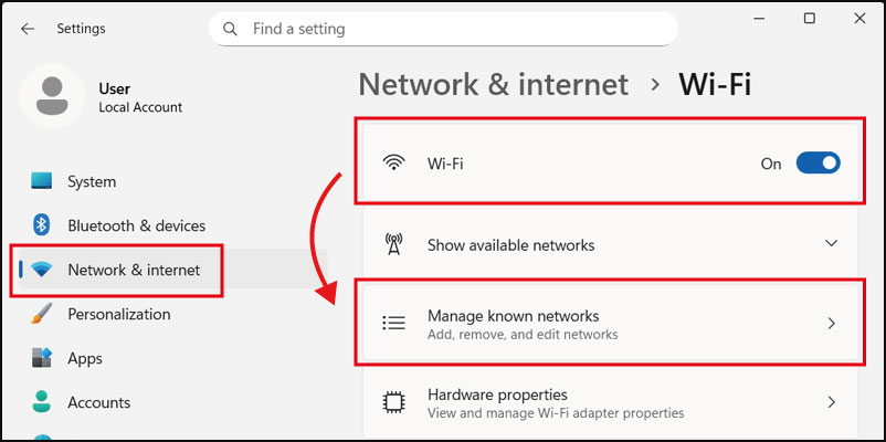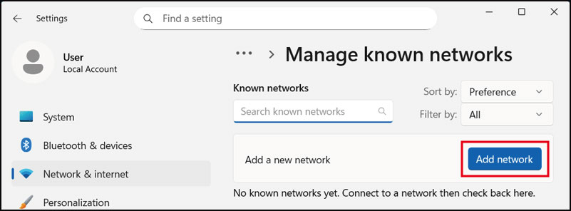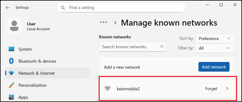 [Network & Internet] - Click [Wi-Fi], then click [Manage known networks].