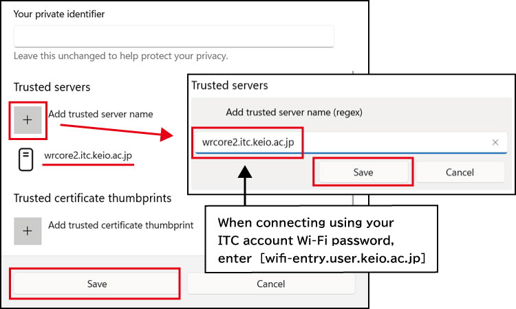 Click the [+] to Add trusted server name, enter wrcore2.itc.keio.ac.jp, then click [Save].