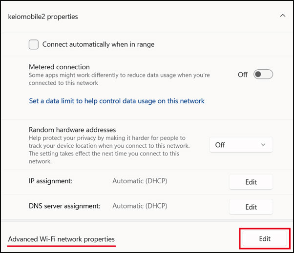 Click [Edit] in [Advanced Wi-Fi network properties].