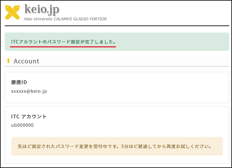 設定が終了すると「ITCアカウントのパスワード設定が完了しました」と表示されます。
