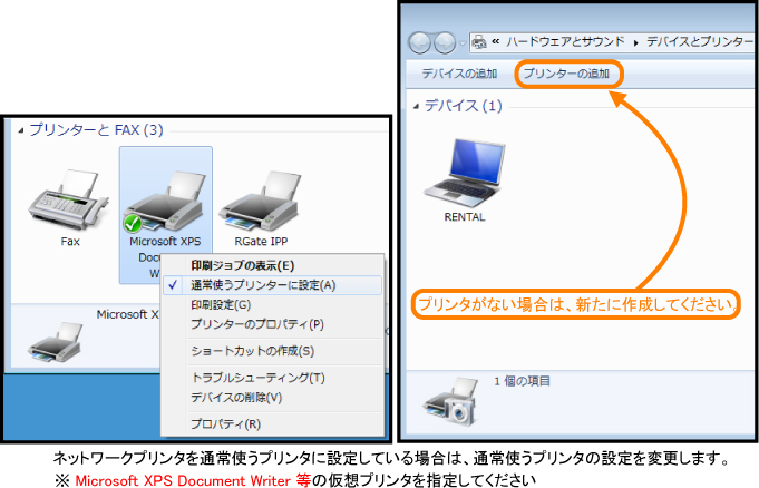 ※ 例として通常使うプリンタの設定を Microsoft XPS Document Writer (仮想プリンタ) に変更・追加しています